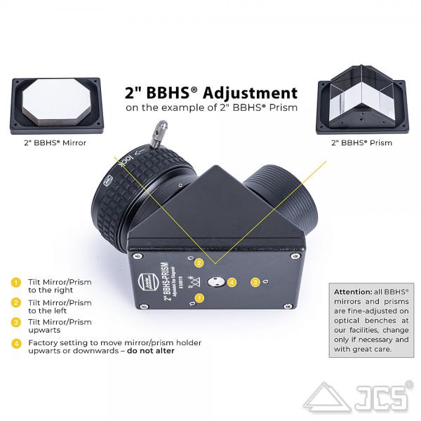 Der BBHS®-Spiegel ist in einem CNC-gefrästem Aluminium-Gehäuse verbaut und auf einer justierbaren Wiege stressfrei gelagert. Genau wie ein hochwertiges Refraktorobjektiv kann auch das Prisma justiert werden. So können vollständig justierbare Systeme realisiert werden, zum Beispiel für die Konstruktion von Bino-Teleskopen. Genau wie bei einem hochwertigen Refraktor müssen Sie an der Justage im normalen Gebrauch nichts ändern: Die 3-Punkt-Ausrichtung wird in unserem Werk so eingestellt, dass das Bild keine merkliche Drehung um sein Zentrum zeigt, wenn der Zenitspiegel in einer korrekt ausgerichteten Okularklemme um 180° gedreht wird. Optische und mechanische Achsen werden auf unseren optischen Prüfständen perfekt aufeinander abgestimmt. Schließen Sie also erst alle anderen möglichen Fehlerquellen aus wie einen verkippten Okularauszug aus, bevor Sie die Justage verändern. Wenn ein BBHS®-Spiegel unsere Fertigung verlässt, ist er mindestens so gut justiert, wie wenn er einfach in ein CNC-gefrästes Gehäuse montiert würde. Über die Justagemöglichkeit ist auch bei höchster Vergrößerung eine perfekte Zentrierung möglich, ohne durch Fertigungstoleranzen eingeschränkt zu werden. Beachten Sie jedoch, dass nach einer Veränderung die Garantie auf die werkseitige Justage des BBHS® Zenitspiegels erlischt. Die restliche Garantie bleibt davon unberührt.