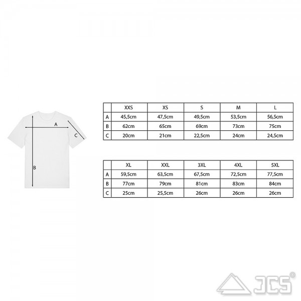 Das T-Shirt ist in den Größen XS bis 4XL erhältlich. Vergleichen Sie die untenstehenden Maße am besten mit einem T-Shirt, das Ihnen gut passt. Legen Sie es dazu flach auf den Tisch und messen Sie die entsprechenden Werte (A, B, C) nach.
