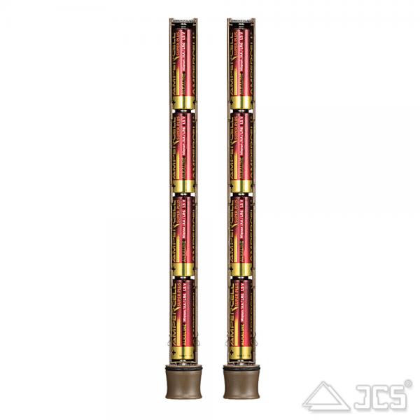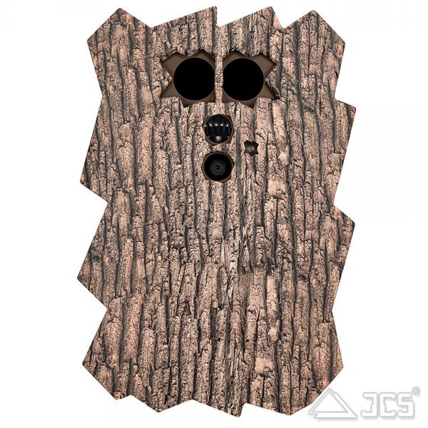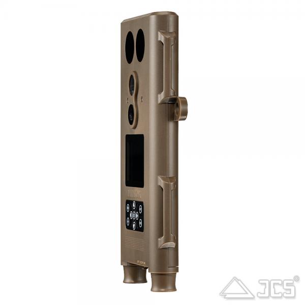 Besonders hervorzuheben ist das durchdachte Batterie-Schnellwechselsystem. Mittels Stangenmagazinen lassen sich die Batterien auch mit klammen Fingern oder Handschuhen bei kalten Temperaturen mühelos austauschen, ohne die Kamera abmontieren zu müssen. Im Lieferumfang ist bereits eine Frontblende mit grober Baumrindenstruktur enthalten, die sich perfekt in europäische Mischwälder einfügt.