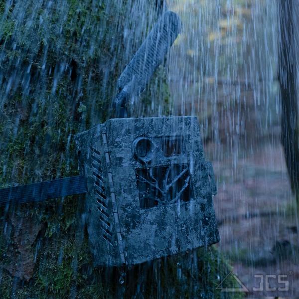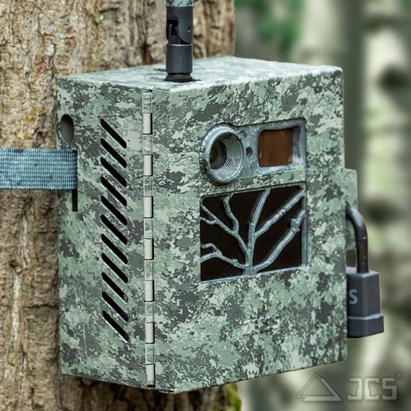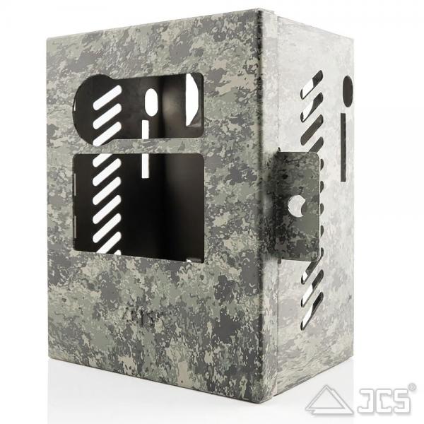Gefertigt aus massivem Stahl, umschließt dieses Gehäuse die ZEISS Secacam 3 vollständig. Dank der passgenauen Aussparungen an der Frontseite bleiben alle Kamerafunktionen vom PIR-Sensor bis zum Objektiv uneingeschränkt einsatzbereit. Das vollflächige Tarnmuster sorgt zudem dafür, dass die Kamera perfekt mit der natürlichen Umgebung verschmilzt und gar nicht erst entdeckt wird.