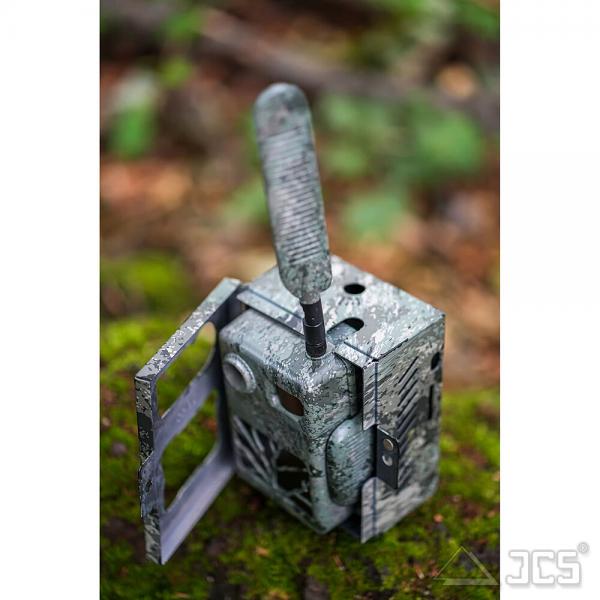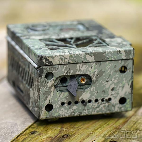 Das Gehäuse wurde speziell für die Bauform der Secacam 7 entwickelt und besteht aus einer robusten Stahlschicht, die die Kamera fast vollständig umschließt. Dank der passgenauen Aussparungen an der Frontseite werden weder das Objektiv noch die Sensoren oder die Infrarot-LEDs in ihrer Funktion beeinträchtigt. Das vollflächige Tarnmuster (Camouflage) sorgt zudem dafür, dass die Kamera optisch mit der Umgebung verschmilzt und gar nicht erst entdeckt wird.