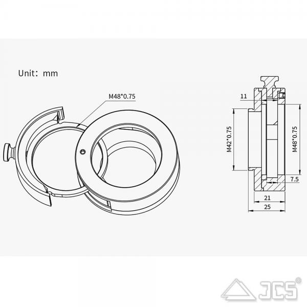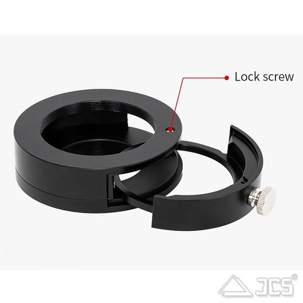 - Kameraseite: T2-Außengewinde (erweiterbar auf M48 über den beiliegenden Adapterring).
